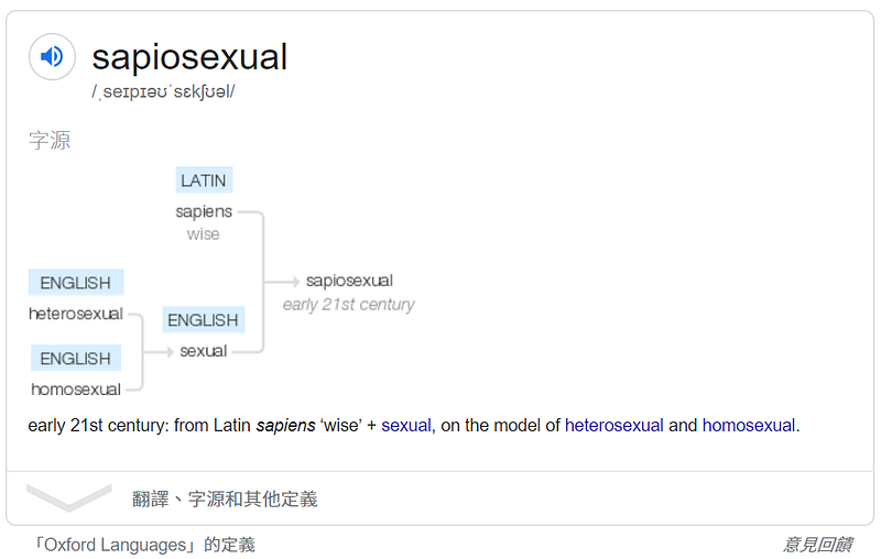 - 要增加對某個知識認識的「面向」,Google 是個好工具,試試看在 Google 打「sapiosexual etymology」(etymology 是「語源學」的意思),就會跳出下面的詞源: