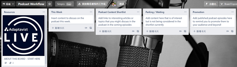 這是 Trello 的範本,把製作 Podcast 橫向分解成 5 個階段,有一個題材後走完 5 個階段就完成了