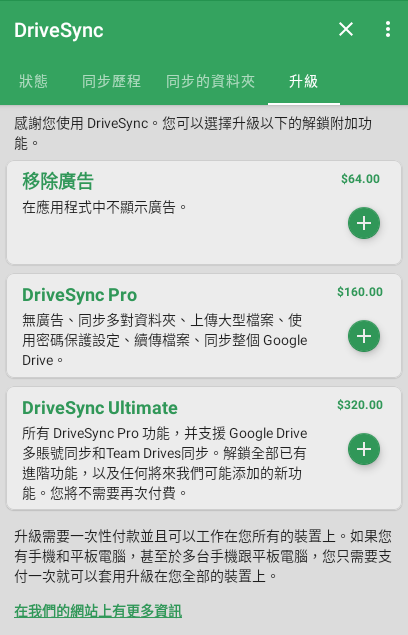 - 免費版只能同步一個檔案夾,付費版(DriveSync Ultimate)則可在多個 Android 設備上同步多個 Google Drive 帳號。