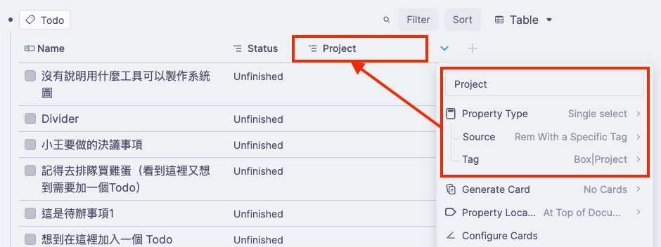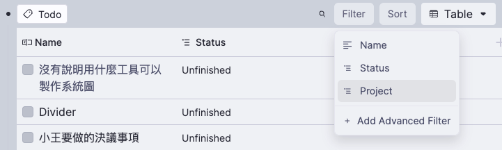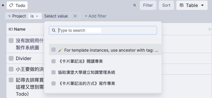 - 這樣每個 Todo 都多了一個「專案」的選項,從表格和筆記都可以用下拉選單選取。