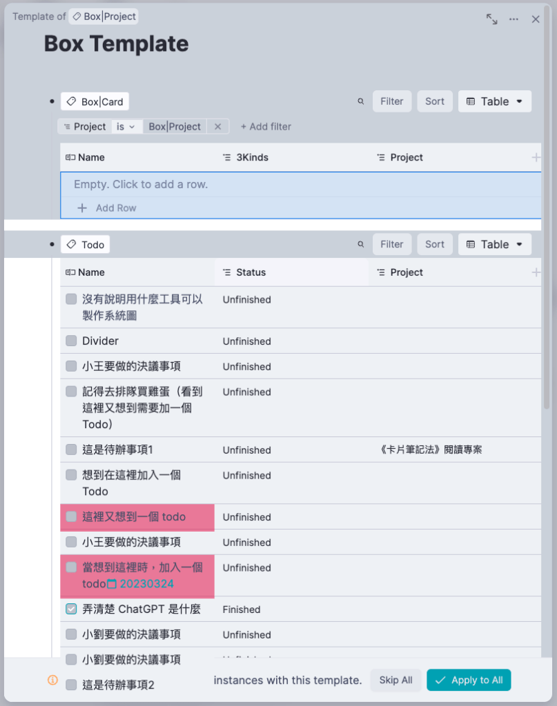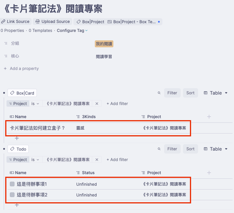 - 回到 Box:Project 的頁面,發現這個 Template 把跟標題有關的 Card 和 Todo 都收集在一起了。