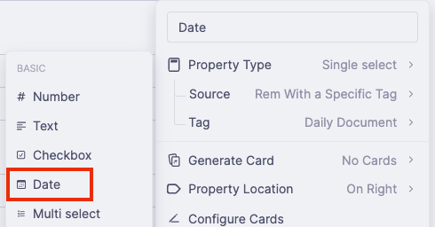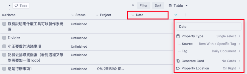 - 剛才你可能有看到 Property Type 有個「Date」的選項,你會覺得奇怪,既然這一欄叫 Date,為什麼不用 Date 格式,而是要用下拉選單裡使用 Daily Document 當標籤呢?不是更複雜嗎?