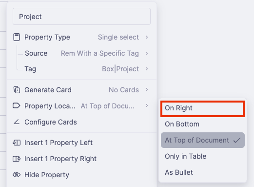 - On Right, On Bottom 會出現在筆記同一個畫面,At Top of Document、Only in Table 在筆記頁隱藏,As Bullet 要在筆記頁展開下一層才會出現。