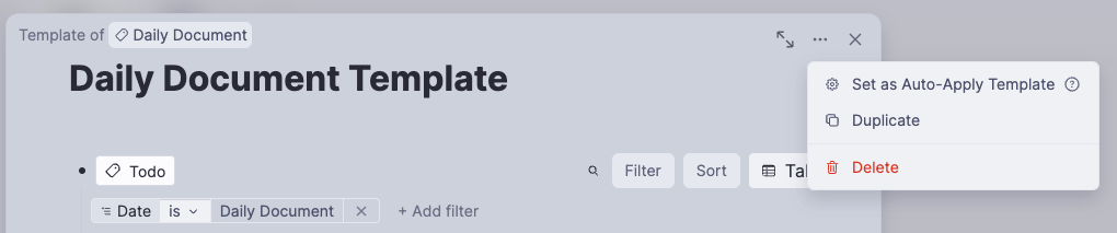 - 這次我們增加一個功能,讓這個模板自動插入,按下模板編輯頁右上角的「…」選擇 Set as Auto-Apply Template,以後每天都會自動插入今天的 Todo。