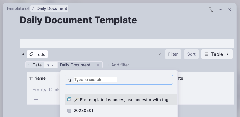 Template 是對 Tag 設置的,而 Tag 會貼在一段文字、Todo 上,被貼標籤的文字叫做「實體」(Instance),在設置 Template 時,不可能知道未來被貼標籤實體的名字,怎麼選擇它呢?「For template instances, use ancestor with tag: …」這個選項,就是指那個「不知名的本資料頁標題」。