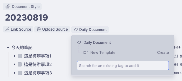 - 從上面的圖可以看到,當一篇一般的筆記貼上「Daily Document」標籤時就變成日誌,所以我們是對標籤設模板的,不同的標籤可以插入不同模板。