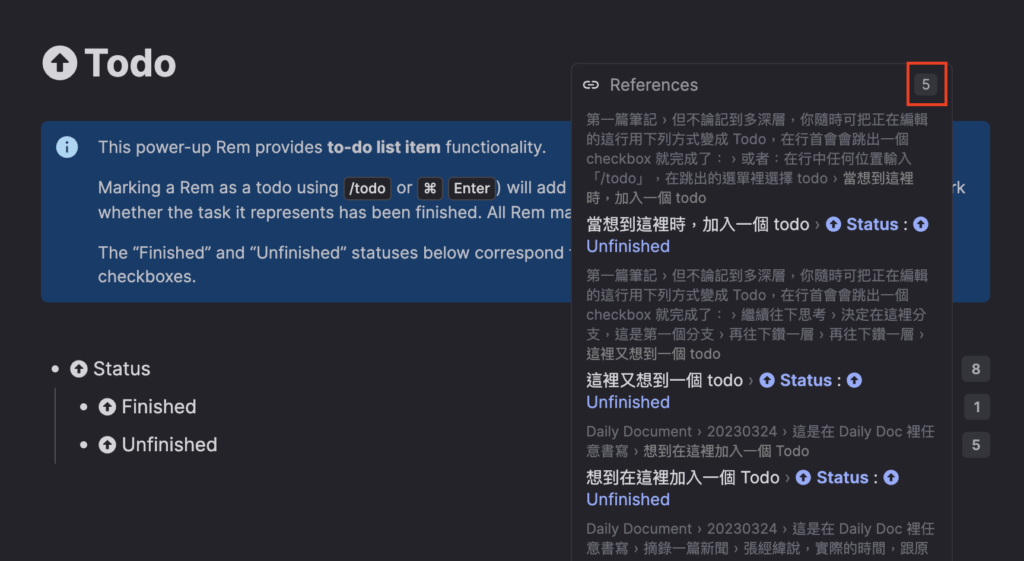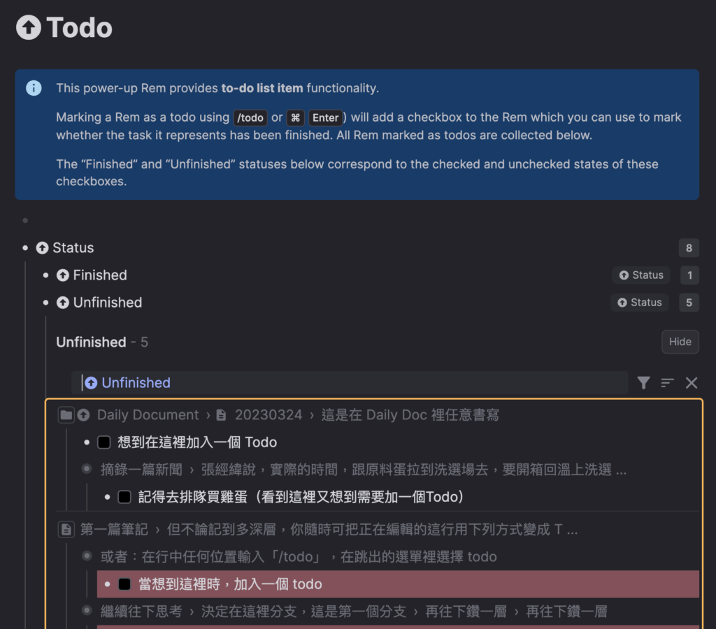 - RemNote 會產出一個 Search Portal,把所有標示為「#Unfinished」的 Todo 收集在下面;