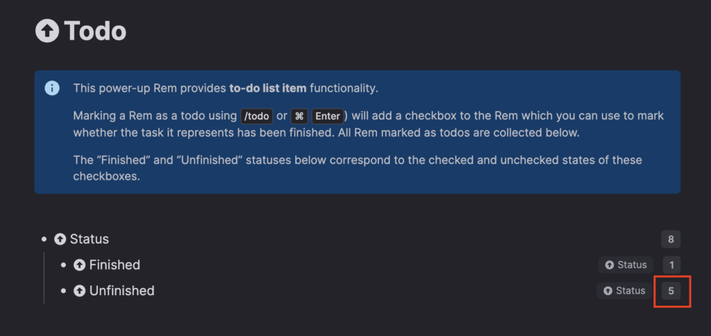 - RemNote 也知道這點,所以它的 Todo Power-up 頁面筆記區已幫你設好兩種狀態(⬆️ Status),包括: