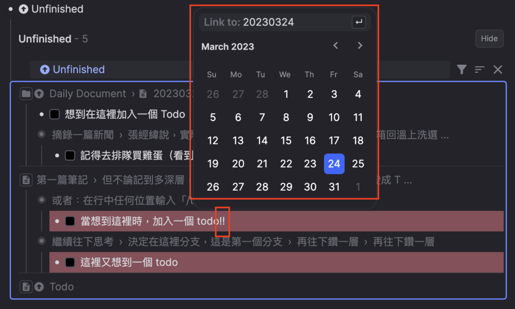 顯示未完成 Todo 及其脈絡: 無需挪動即可在 Unfinished 中展開它以及它的相關筆記縮影: 需要花時間找到原筆記,閱讀來恢復記憶