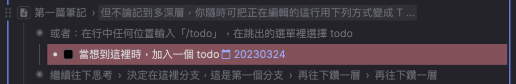 - 但不論記到多深層,你隨時可把正在編輯的這行變成 Todo,行首會跳出一個 checkbox 就完成了,用下列 2 種方式均可: