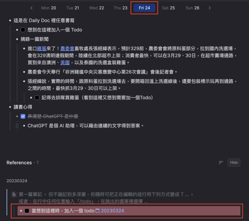 - 在下方「連結區」會看到這個 todo 顯示在「References」下,這就是你的今日任務了