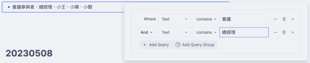 - 不同條件可以疊加,例如下面這個例子,當篩選內含「會議」的筆記時出現很多條。