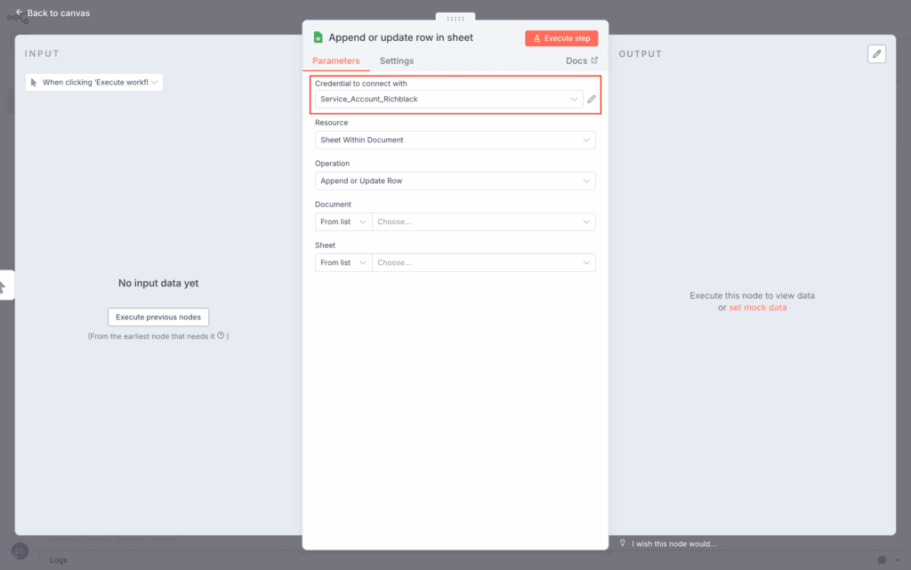 Sheet 節點會把你帶到這個畫面,打開上面的 Credential to Connect with,如果你還沒設定,這裡會空白顯示錯誤,如果你曾經設定過 OAuth2,可從下拉選單選擇新增 Credential。