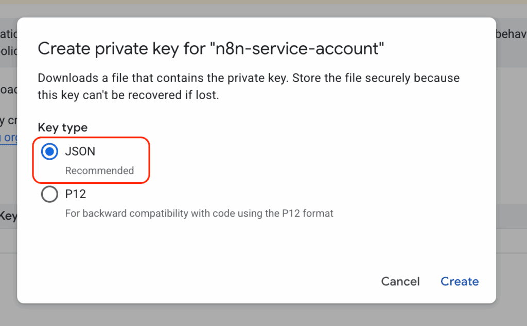彈出視窗選擇 JSON 格式,然後點選 Create ,瀏覽器會下載一個 JSON 檔案。