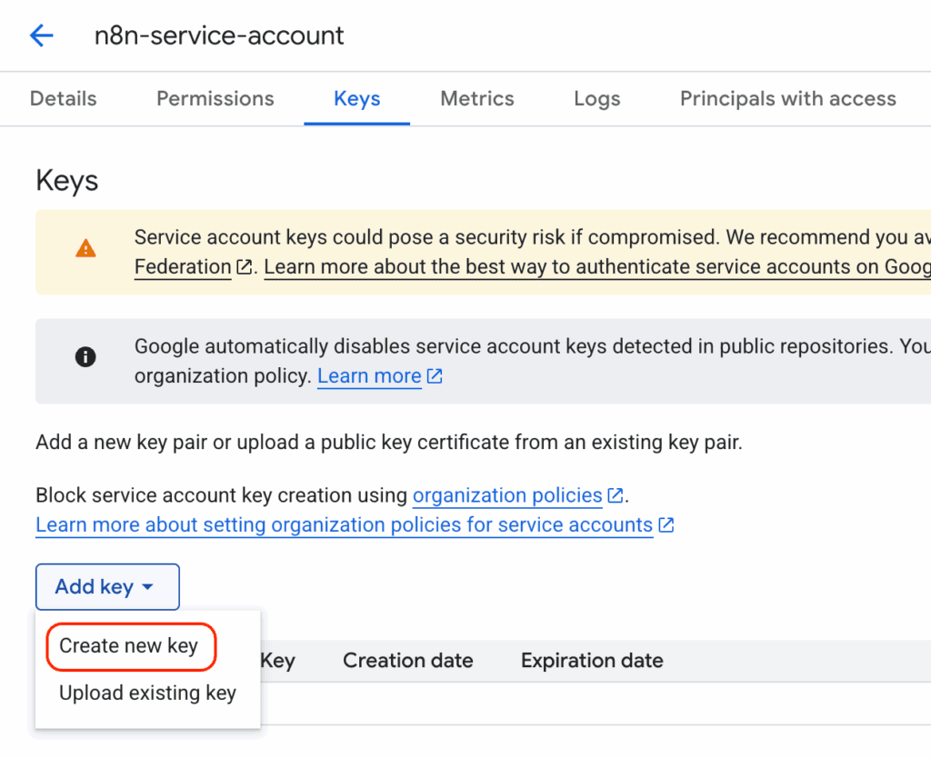 - 因為 n8n 是機器人,就是個「服務」,用「服務帳號」Service Account 讓服務有自己的帳號。