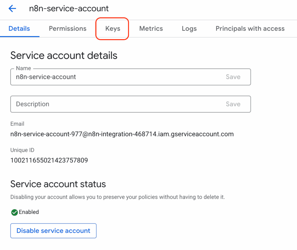 n8n-service-account@your-project-id.iam.gserviceaccount.com。 - 複製這個完整的電子郵件地址。