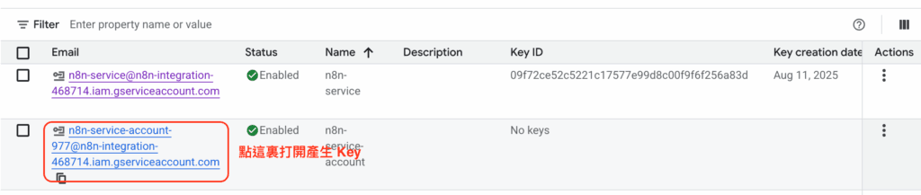 - 回到 GCP 控制台的 Service Accounts 頁面。