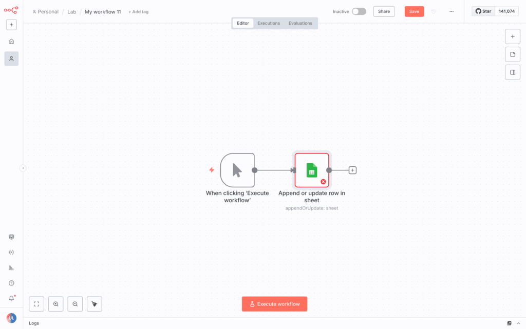 - 打開 n8n,增加一個最簡單的手動 trigger 後,新增一個 sheet 節點,它會跳出一大堆功能,都不重要,任選一個