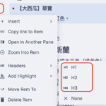 • 方法1:選擇整行,Popup 選單選擇 H1 ~ H3。 方法2:行左「6 個點」把手/ Headers/ H1H3 RemNote 改變標題字體大小的4種方法方法3:輸入「/」叫出「“/” 選單」/ Header/ H1~H3 方法4:快速鍵「⌘ + ⌥ + 13」選擇 H1~H3